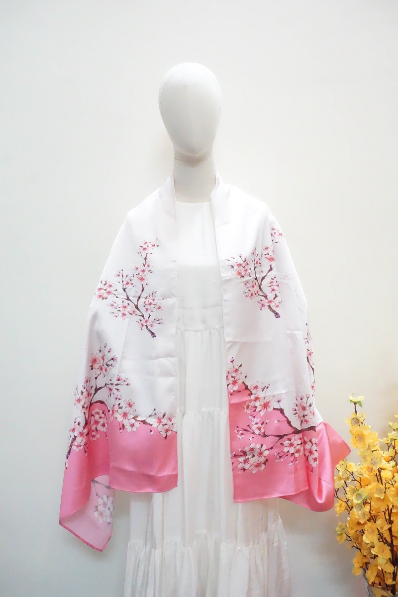 Hoa đào cũng là một trong những hoạ tiết được lựa chọn nhiều mỗi khi đến dịp tết đến xuân về. Cùng với hoa mai ở miền Nam thì dòng hoa đào ở miền Bắc được chị em tin dùng. Mẫu khăn lụa tơ tằm hoa đào được ưu tiên lựa chọn hơn hẳn bởi vẻ đẹp nhu mì, nhẹ nhàng màu hồng phấn.