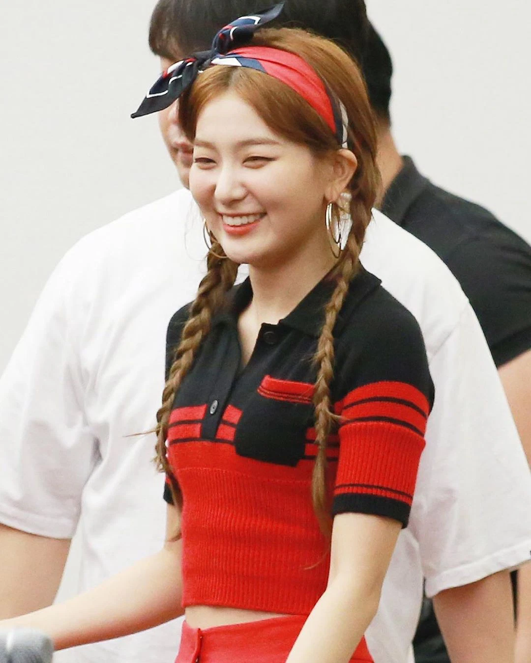 Cô nàng Na Yeon của nhóm Twice cũng là người cực kỳ yêu thích chiếc khăn lụa điệu đà, trong khi đó nàng Red Velvet lại chọn cho mình một chiếc khăn lụa vuông cao cấp để làm dây buộc tóc.