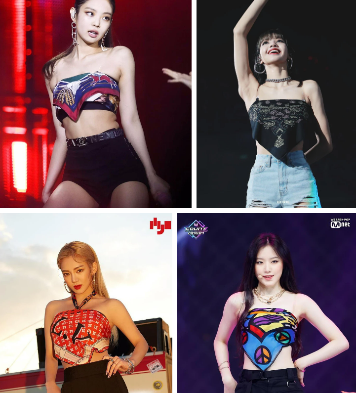 Idol của giới trẻ, cô nàng Lisa sử dụng khăn lụa màu đỏ thắm để làm áo, khiến cho vóc dáng vốn đã gợi cảm của mình càng trở nên bùng cháy. Và nàng Jenny của Blackpink lại không kém cạnh khi sử dụng chiếc khăn lụa tơ tằm màu đỏ để buộc phần eo của mình.