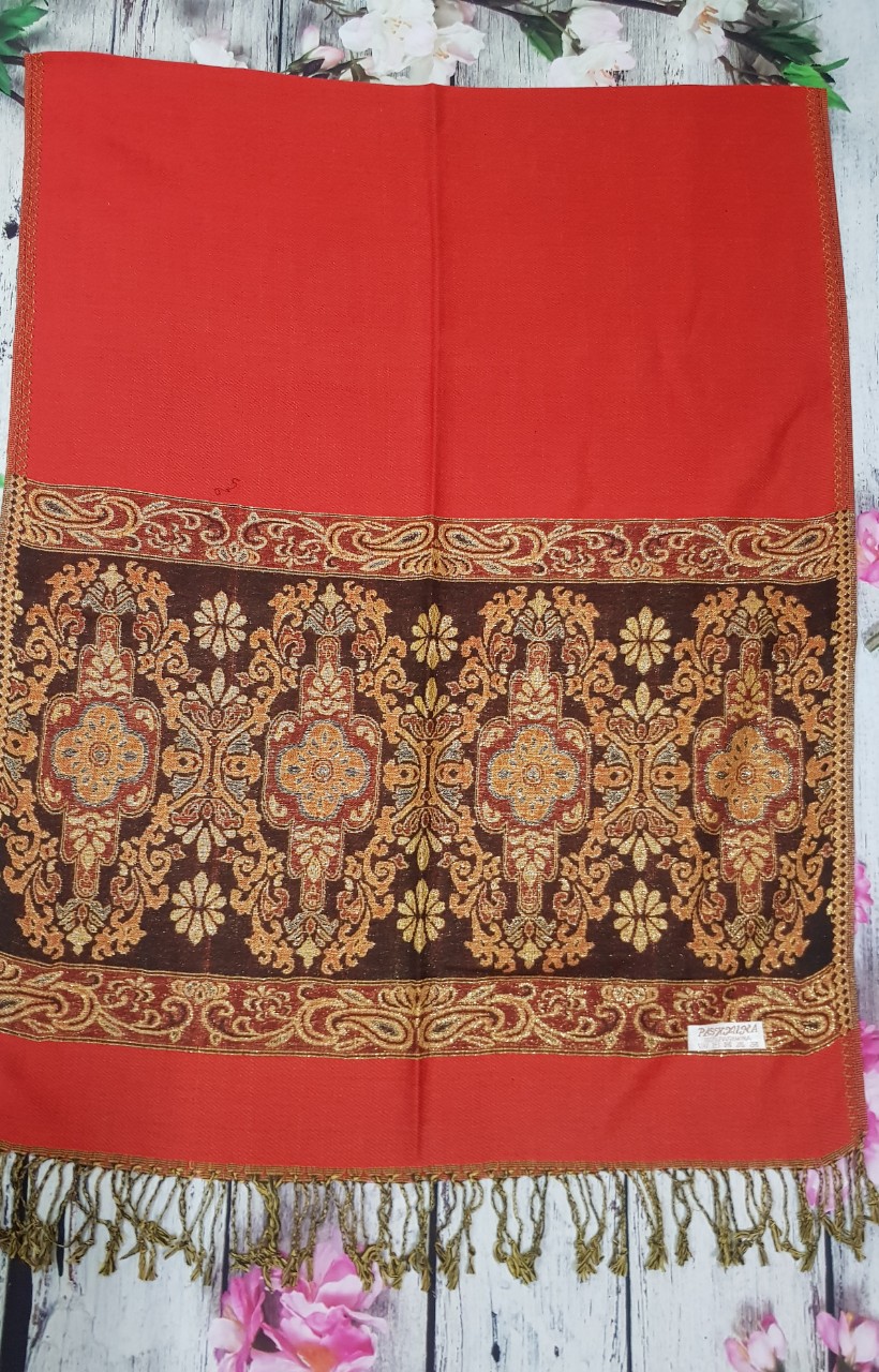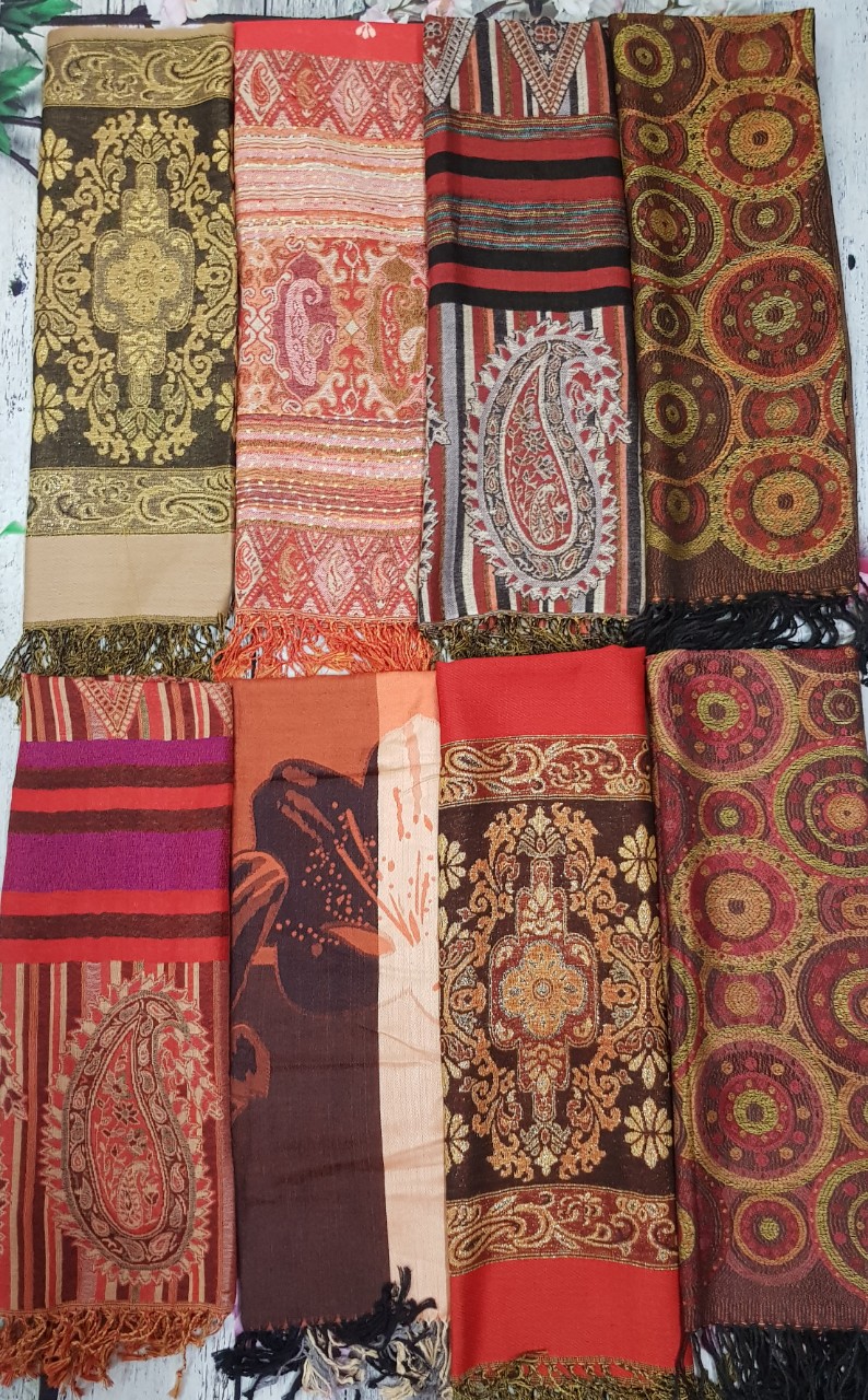 Trên vùng đất Tây Tạng rộng lớn, những dòng khăn thổ cẩm Pashmina được xem là một biểu tượng giúp làm ấm, và tạo ra một thế giới hoà bình. Khăn thổ cẩm Pashmina được làm bằng sợi tổng hợp, sản phẩm có kích thước khổ rộng khoảng 0.8m và chiều dài từ 1m8 trở lên. Đây là sản phẩm thổ cẩm nên những hoa văn nằm trên dòng khăn thổ cẩm này quả thực rất độc đáo. Đó là hình tượng cây rừng, hoa lá, là con người, là chim cú, động vật hoặc những biểu tượng hình tròn, vuông, tam giác…