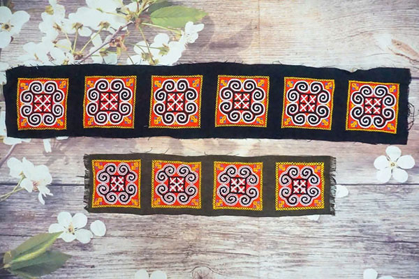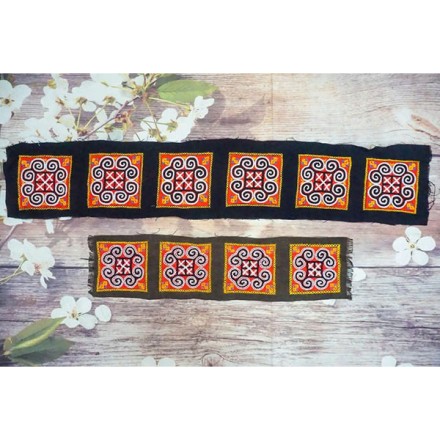 Vải thổ cẩm dân tộc Hmong được thêu tay thành từng ô để cắt làm quần áo hoặc phụ kiện tùy vào sở thích của khách hàng. Sản phẩm được thêu tay tỉ mỉ, với những họa tiết độc đáo chỉ có ở người dân tộc Hmong,Sapa, Việt Nam.