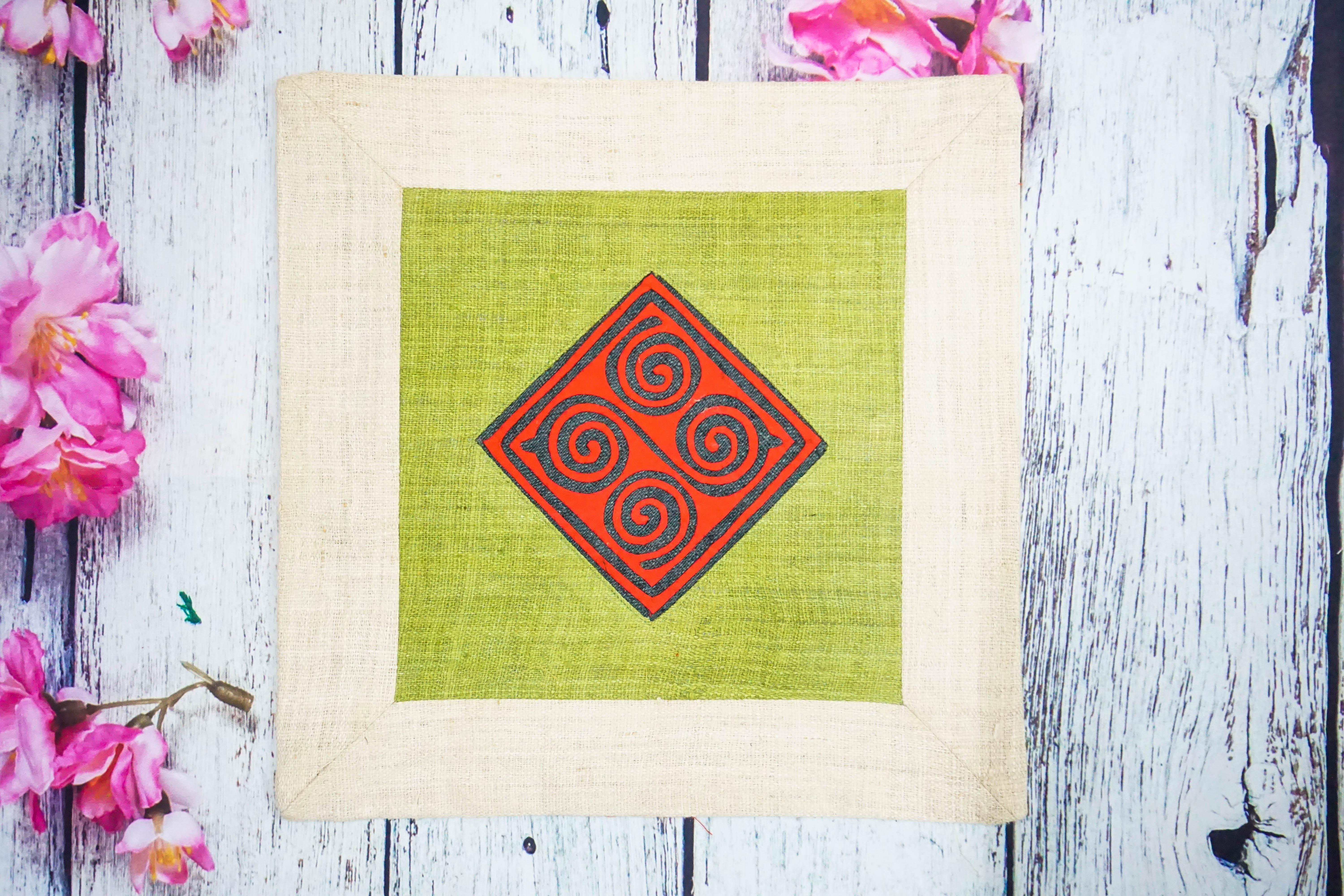 Tranh thổ cẩm dân tộc Hmong với chữ Thọ, tranh cầu chúc cho sự an nhiên, hạnh phúc, gặp nhiều may mắn. Sản phẩm làm bằng sợi lanh, kết hợp thêu hoa văn tinh tế của người Hmong.
